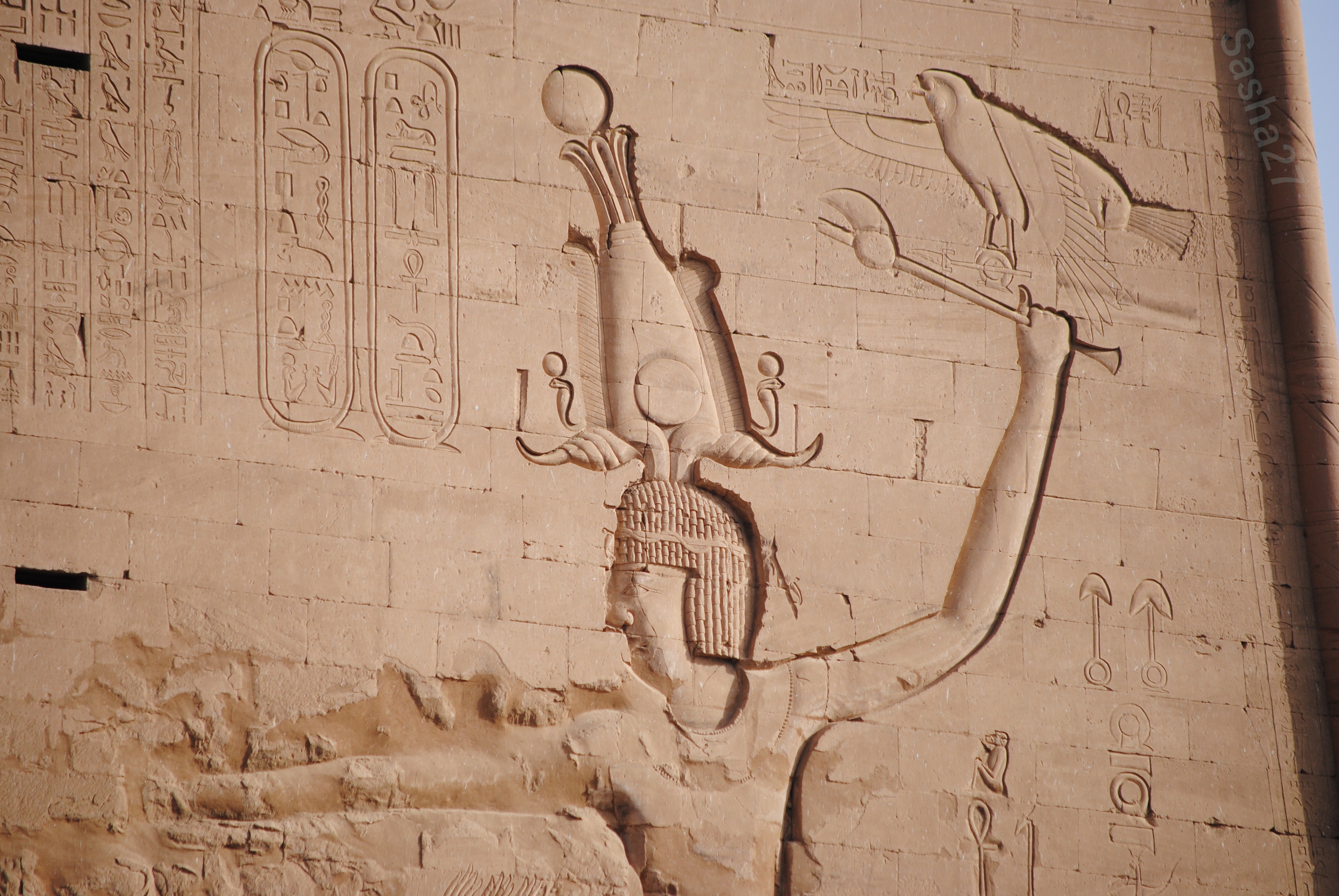 Au temple d’Edfou, le dieu adoré est Horus. C’est le fils du dieu Osiris et de la déesse Isis. C’est le dieu de la vengeance. Le dieu Horus est en général représenté par un faucon, avec un corps humain. Horus est adoré notamment car il est prétendu qu’il a libéré l’Egypte des celtes.