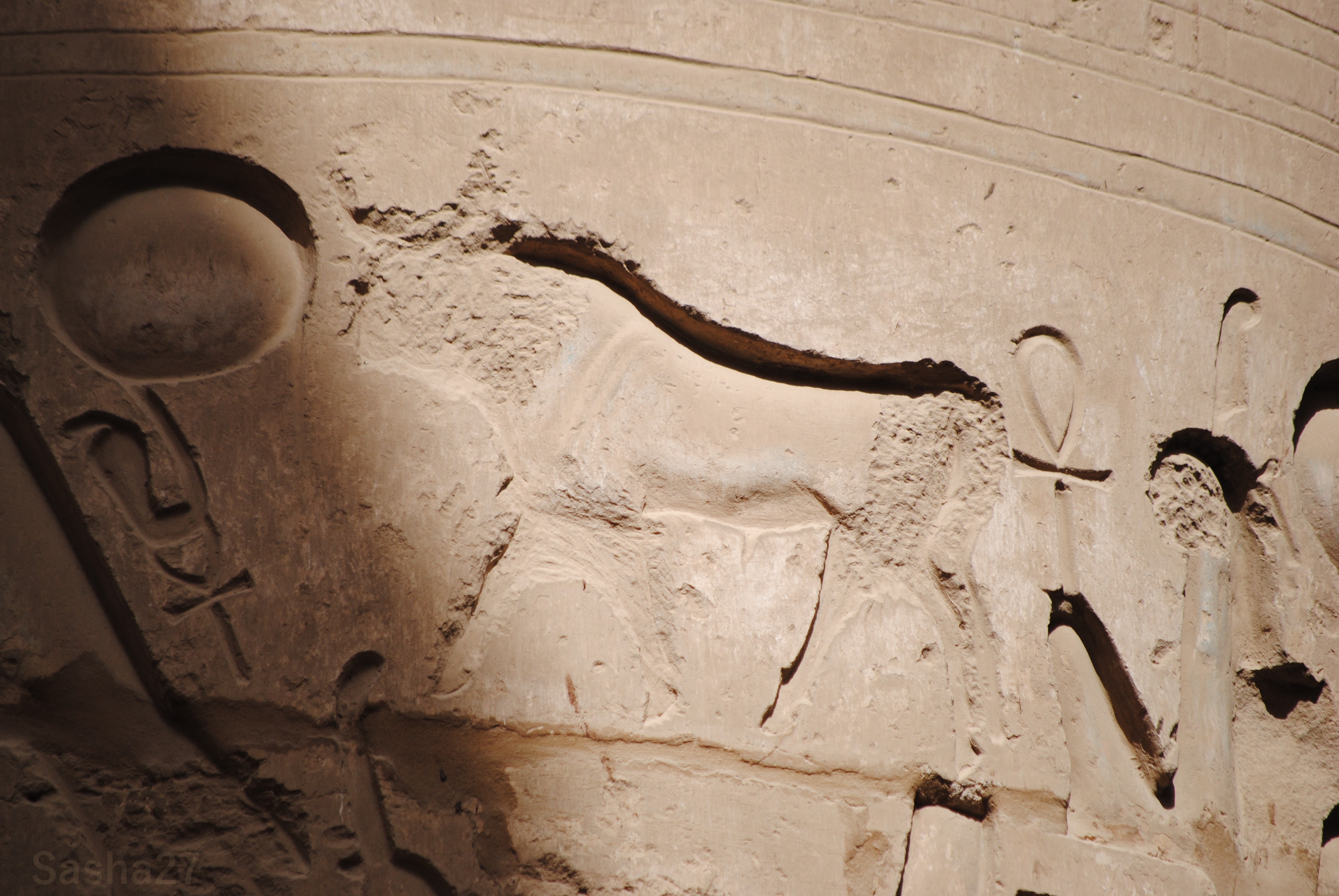 Le temple de Karnak est le temple le plus grand d’Egypte. A son entrée, Ramsès II y a construit une allée de sphinx. C’est ainsi devant chaque porte. Le terme « sphinx » est grec et associe la tête d’humain, qui représente l’intelligence, avec le corps de lion, qui représente la force. Le sphinx représente le Roi, ce-dernier possédant une grande intelligence et une impensable force.