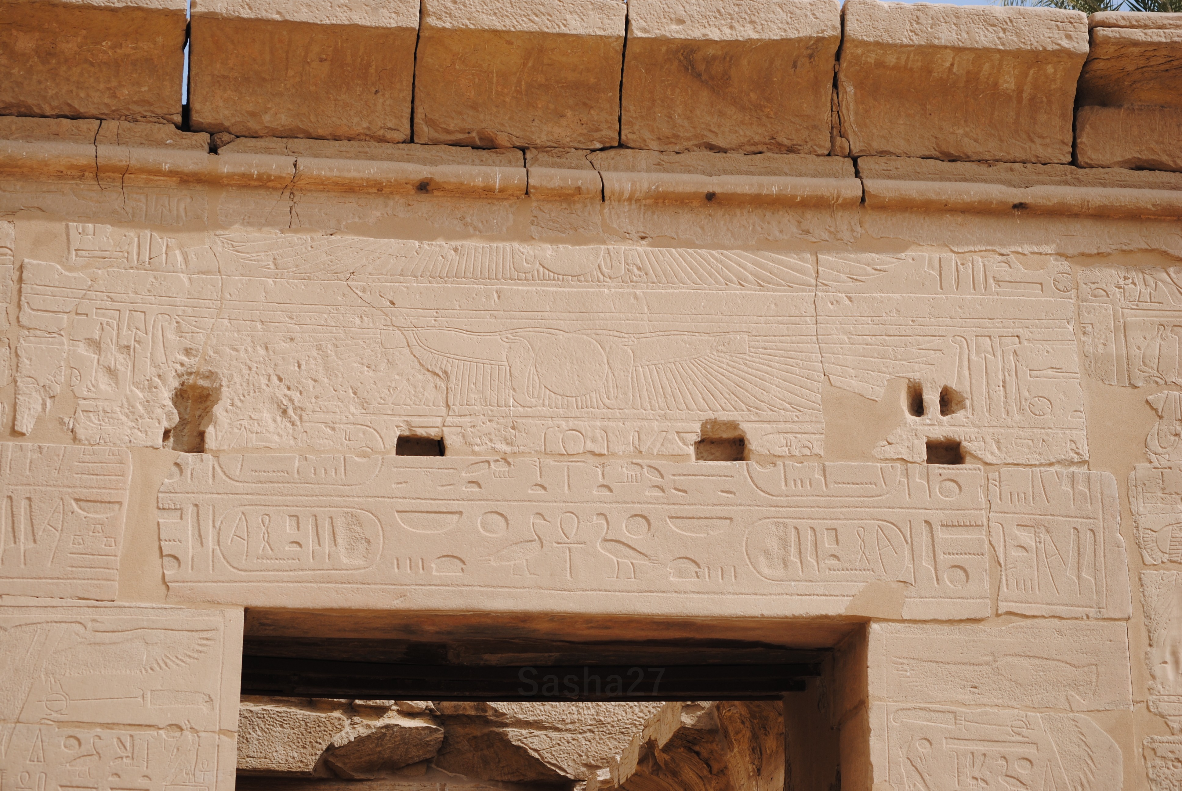 Le hiéroglyphe avec un Soleil et un oiseau en dessous représente le fils de Dieu. En effet, l’oiseau est comparé au fils, et le Soleil au Dieu, car Amon (dieu du Soleil) était le dieu le plus adoré de l’Egypte pharaonique. Le dieu Amon est également représenté par une tête de bélier (que l’on aperçoit sur certains sphinx de l’allée de sphinx).